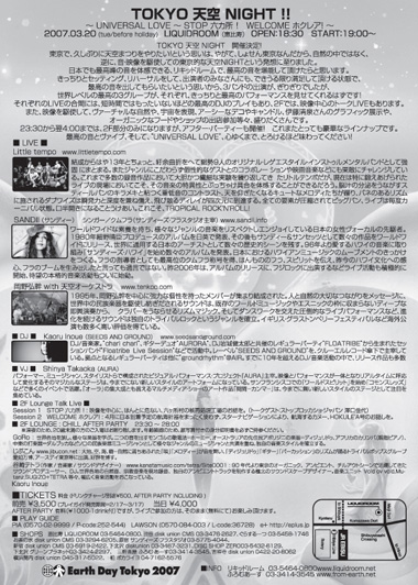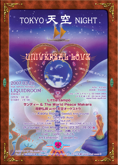 3/20 TOKYO 天空 NIGHT !! いよいよ! ついに、この日がやってきました!!! チケット まだお持ちでない方、 当日券は、 3/20 当日、17:30より、会場にて、発売です! 会場のキャパシティーは大きいので、 完売で入れないという心配はございません。 ですので、遅くいらしゃっても、 当日券は購入できます。 前売り券も、 前売り扱い協力店舗では、当日の夕方位まで、購入可能です。 |