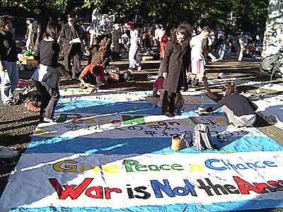 こないだのアメリカでのテロ事件でのアメリカの報復戦争にNOの意思表示をするために、毎週日曜日、代々木公園〜渋谷〜原宿を歩いています。(写真右=9/22、ペイント風景)